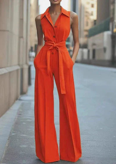 Damski kombinezon z dekoltem V i szerokimi nogawkami w eleganckim stylu